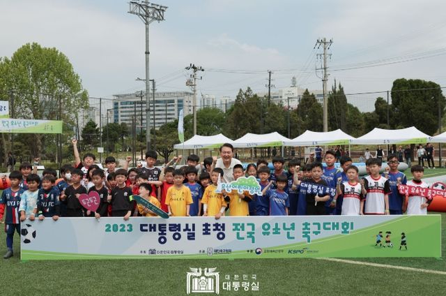 이어 윤 대통령은 스포츠 필드 내 축구장에서 진행 중인 전국 유소년 축구대회 현장을 찾았다. 전국 유소년 축구대회는 U8, U10, U12세로 구성된 약 800여 명의 선수들이 지난 4월 29일(토)부터 주말 간 리그전을 통해 경기를 진행해 왔다. 윤 대통령은 경기에 참석한 어린 선수들과 前 국가대표 김태영 선수가 진행하는 축구클리닉에 함께 참여해 축구 패스 코칭 및 트래핑 대결을 통해 선수단을 격려했다.