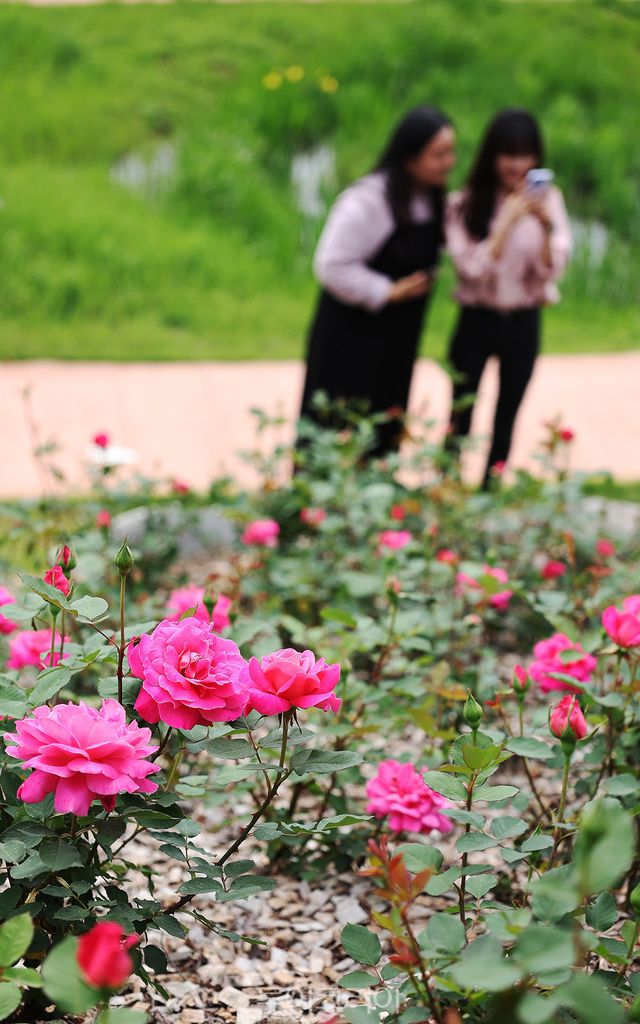 14일 함평엑스포공원 장미원에 나들이 나온 관광객이 고운 자태의 장미꽃 사진을 핸드폰 카메라에 담고 있다.
