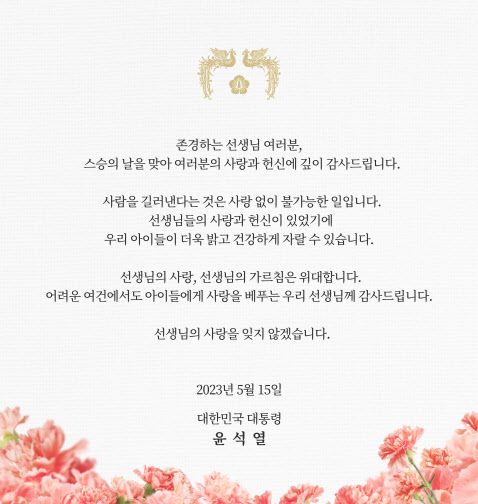 윤 대통령은 이날 사회관계망서비스(SNS)에 “존경하는 선생님 여러분, 스승의 날을 맞아 여러분의 사랑과 헌신에 깊이 감사드린다”며 이같이 밝혔다.