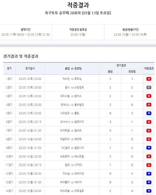 스포츠토토 공식 인터넷 발매 사이트 베트맨 홈페이지에 공지된 축구토토 승무패 28회차의 적중 결과에 따르면, 회차 총 발매금액은 약 30억 원, 환급금액은 약 15억 원, 적중 투표수는 약 1만5000건으로 집계됐다.