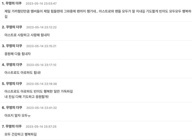 진진이 남긴 글을 본 네티즌들은 “멤버들도 힘들 텐데 팬들까지 챙기네”, “아스트로 힘내라”, “다들 힘내자”며 댓글을 남겼다.