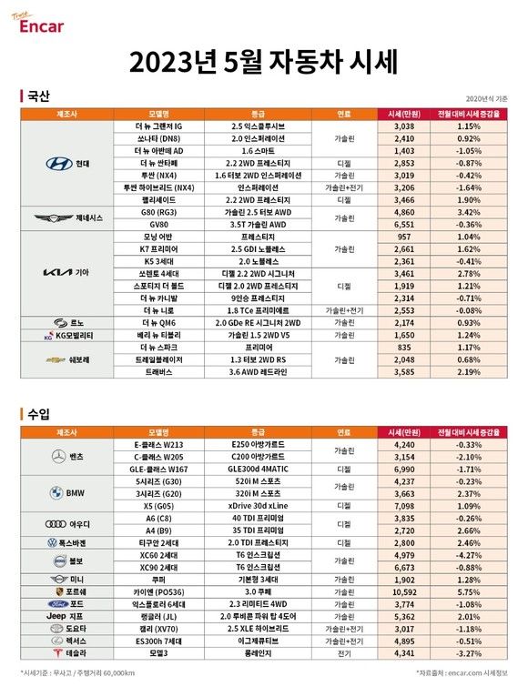 [프라임경제] 국내 자동차 거래 플랫폼 엔카닷컴이 5월 중고차 시세를 공개했다. 이번에 공개된 중고차 시세는 엔카닷컴 빅데이터를 토대로 국내외 완성차 브랜드 2020년식이며, 주행거리 기준 6만㎞ 및 무사고 차량을 대상으로 분석했다.