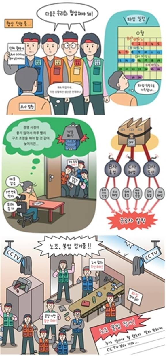 구체적으로 카툰북에서는 사용자 범위 확대에 따른 교섭·파업 급증의 문제점을 다뤘다. 연중 내내 줄줄이 놓인 파업과 교섭 일정에 치여 정작 기술 개발과 신규 시장 발굴은 물론 생산 차질까지 겪으며 기업 경쟁력 악화에 직면한다는 내용이다. 또한, 카툰북에서는 구조조정이 필요함에도 노조 반대에 회사가 결국 문을 닫게 되는 상황을 예시로 들며 노동쟁의 범위 확대에 따른 경영권 간섭 심화 문제를 지적했다.