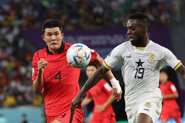 김민재가 지난해 11월 28일(현지 시각) 카타르 알라이얀 에듀케이션 시티 스타디움에서 열린 2022 카타르 월드컵 조별리그 H조 2차전 대한민국과 가나의 경기에서 윌리엄스와 치열한 볼 다툼을 벌이고 있다. / 이하 뉴스1