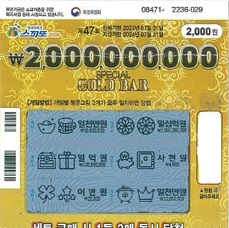 스피또2000 당첨금은 1등이 10억원(6매), 2등이 1억원(18매), 3등이 1000만원(150매), 4등이 2만원(8만2500매)이다.