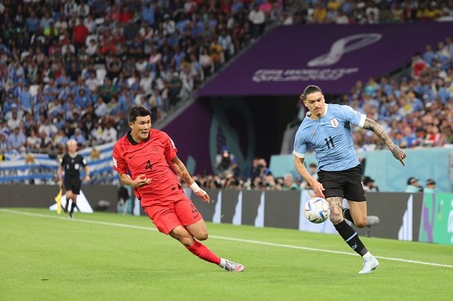김민재가 지난해 11월 24일(현지 시각) 카타르 알라이얀 에듀케이션 시티 스타디움에서 열린 2022 카타르 월드컵 조별리그 H조 1차전 대한민국과 우루과이의 경기에서 누녜스의 드리블을 저지하기 위해 쫓다 미끄러져 넘어지고 있다. / 이하 뉴스1