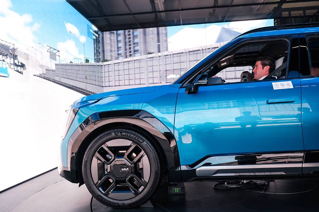 新莱昂州州长塞缪尔·亚历杭德罗·加西亚·塞普尔韦达在电动汽车展厅试驾起亚电动汽车EV9。【图片提供 网络】