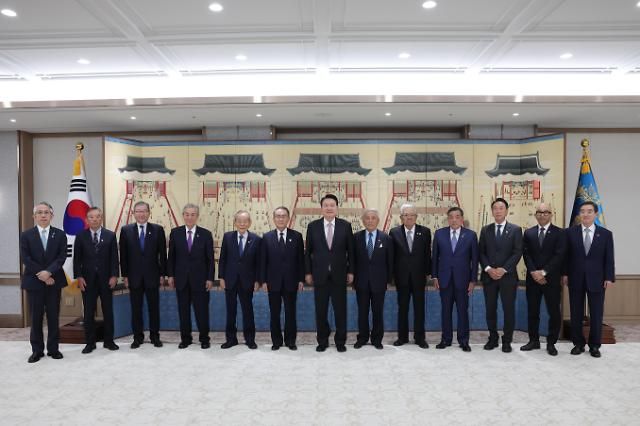 韩国总统尹锡悦(中)日前在首尔龙山总统府与韩日经济人会议日方代表团合影留念。【图片来源 韩联社】