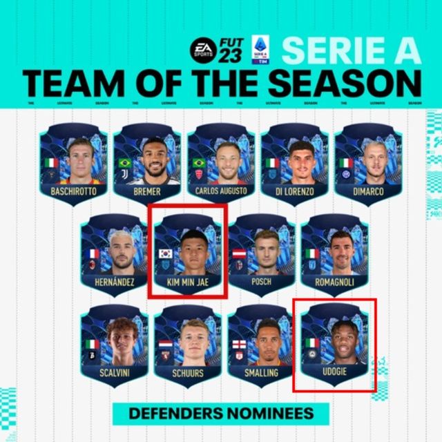 EA Sports FIFA는 16일(한국시간) 공식 홈페이지를 통해 2022-23시즌 세리에A TOTS(Team Of The Season-TOTS) 후보 45명을 공개했다. 매체는 각 포지션별로 후보를 선정해 투표를 진행 중이다. 1989-90시즌 이후 33년 만에 세리에A 트로피를 들어올린 나폴리 선수들이 7명이 뽑혔다. 김민재도 수비수 부문 후보에 선정됐다.