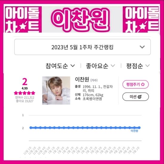 이번 랭킹에서 이찬원은 211,312표를 받으며 '65주 연속' 2위를 달성했다.