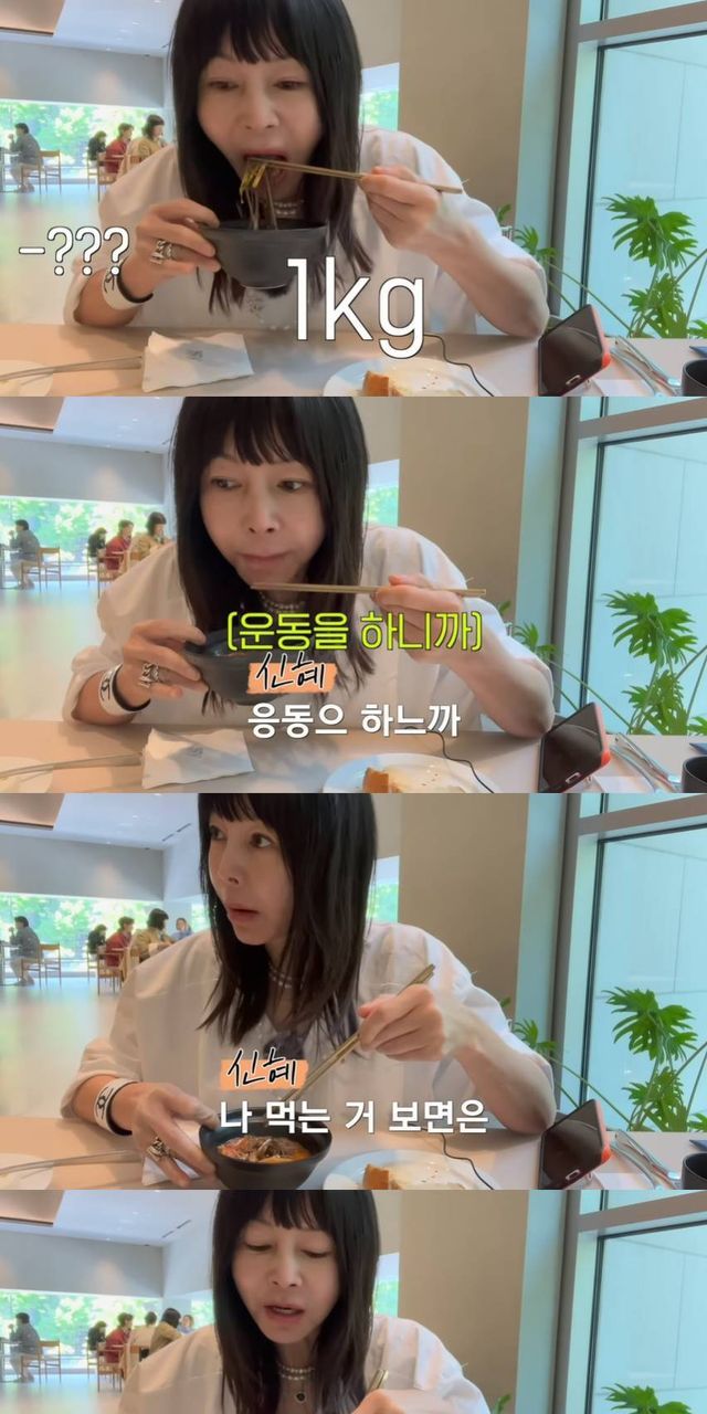 1kg 찐 것으로 우는소리를 하던 황신혜는 "운동을 하니까 1kg 찌지 나 먹는 거 보면 3~4kg는 거뜬히 찐다. 운동하니까 이 정도 유지한 거다"라며 망언을 이어갔다. 하지만 먹을 때면 세상 행복해하며 뛰어난 먹성을 보여주기도 했다.