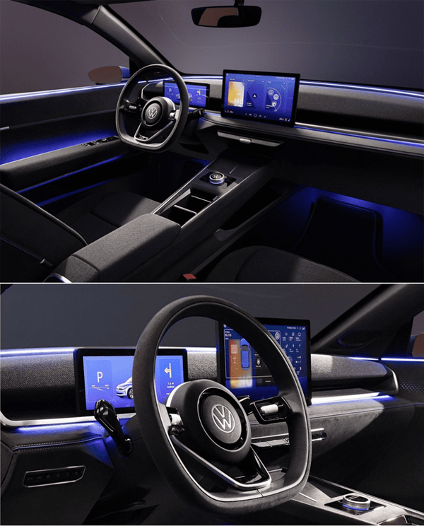 ID.2all의 내부 전면부는 디지털 스크린이 주를 이루고 있다. 먼저 10.9인치 레터박스 형식의 계기판 디스플레이와 중앙 터널 위에 위치한 12.9인치 두 번째 태블릿이 있다. 열선 시트와 기본적인 공조 조작 버튼이 일부 살아있는 모습을 볼 수 있다. 또한 화면 아래에 있는 온도를 조절하기 위한 하드 키와 폭스바겐 고유의 터치 감지 버튼 대신 스티어링 휠에 드럼식 컨트롤이 장착되어 있다.