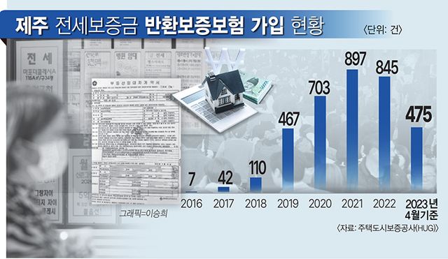 올해 4월까지 제주에서 발생한 전세보증금 미반환 사고는 22건·41억3500만원으로 나타났다. 이는 작년 상반기 보증사고(9건·12억원)를 훨씬 뛰어넘는 규모다. 전세보증보험에 가입하지 않은 이들의 경우까지 포함하면 전세금을 제때 돌려받지 못하는 피해 사례는 더 많을 수 있다.