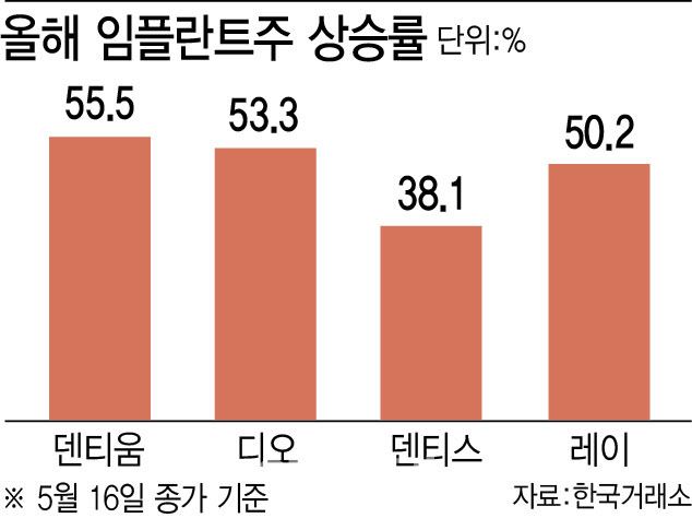 16일 한국거래소에 따르면 국내 임플란트 시장 점유율 2위 업체인 덴티움(145720)은 전 거래일 대비 3.39% 오른 15만5500원에 거래를 마쳤다. 덴티움의 주가는 올 들어 55.5% 급등했다. 코스닥 상장 임플란트 업체인 디오(039840)도 올 들어 주가가 53.5% 올랐고, 덴티스(261200)도 38.1% 상승했다.