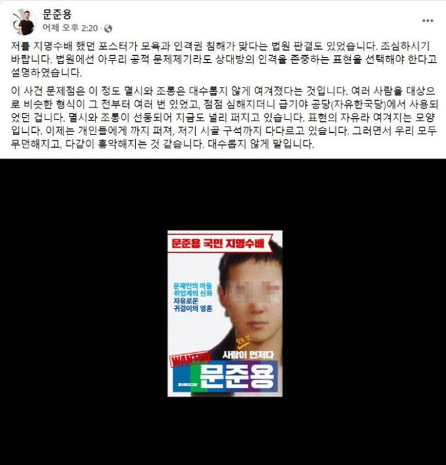 이와 관련해 문 작가는 지난해 8월 24일 SNS를 통해 “저를 지명수배했던 포스터가 모욕과 인격권 침해가 맞다는 법원 판결도 있었다”며 “조심하시기 바란다”고 경고하기도 했다.