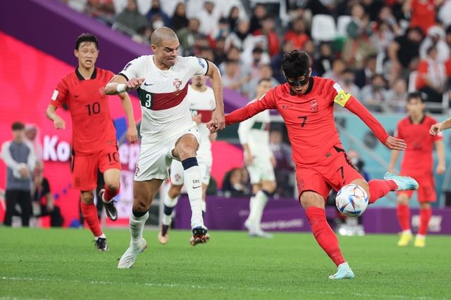 손흥민이 지난해 12월 2일(현지 시각) 카타르 알라이얀 에듀케이션 시티 스타디움에서 열린 2022 카타르 월드컵 조별리그 H조 3차전 대한민국과 포르투갈의 경기에서 상대문전을 향해 중거리 슛을 시도하고 있다.