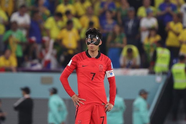 손흥민이 지난해 12월 5일(현지 시각) 카타르 도하 스타디움 974에서 열린 2022 카타르 월드컵 16강 대한민국과 브라질의 경기에서 전반전에서 대한민국의 연속실점으로 어두운 표정을 짓고 있다. / 이하 뉴스1