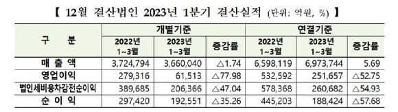 [아이뉴스24 오경선 기자] 경기 침체 우려 속에서 1분기 유가증권시장(코스피) 12월 결산 상장사들의 영업이익이 3분의 1토막 수준으로 감소한 것으로 나타났다.