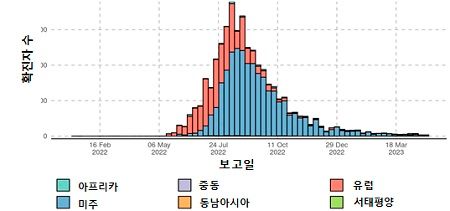 2022년 8월 2주차(8.8.~8.14.) 7,576명 발생 이후 감소하는 추세지만 아시아 지역은 지난 2~3월 이후 증가세가 지속되고 있다.