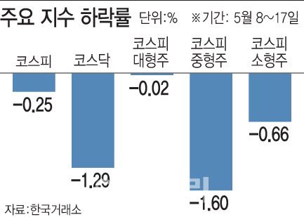 코스피 대형주는 최근 양호한 방어율을 기록하며 중형주, 소형주를 제치고 두각을 나타내고 있다. 지난 8일부터 이날까지 하락률이 0.02%에 그치며 코스피 중형주(-1.60%), 소형주(0.66%)를 가뿐하게 따돌렸다. 같은 기간 코스피(-0.25%)와 코스닥(-1.29%)와 비교해도 낙폭이 미미하다.