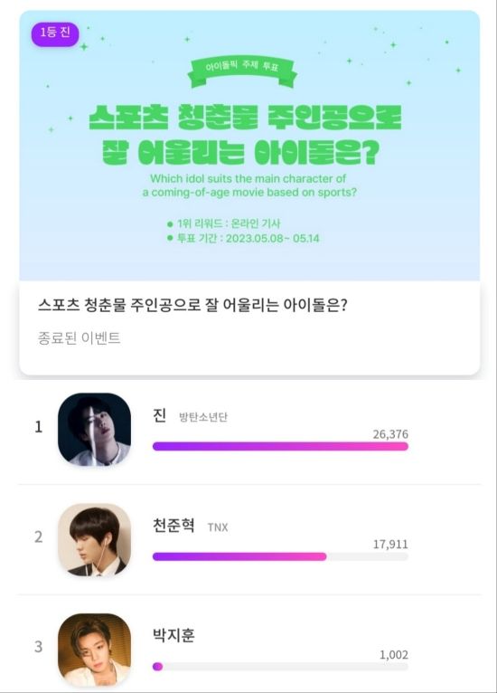 최근 '아이돌픽(idolpick)'은 스페셜 투표 "스포츠 청춘물 주인공으로 잘 어울리는 아이돌"을 진행했다. 이 투표는 5월 8일부터 14일까지 진행됐으며, 방탄소년단(BTS) 진은 총 2만 6376픽을 받아 1위를 차지했다.