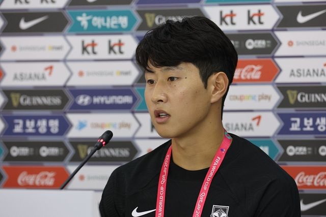 이강인이 지난해 11월 14일(현지 시각) 카타르 도하 알 에글라 트레이닝센터에서 가진 첫 훈련에 앞서 취재진과 인터뷰하고 있다. / 뉴스1