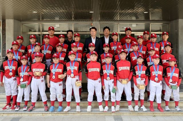| ▲ 국유소년야구대회 준우승 신흥초 야구부 학생들과 대전시의회 이상래 의장 |