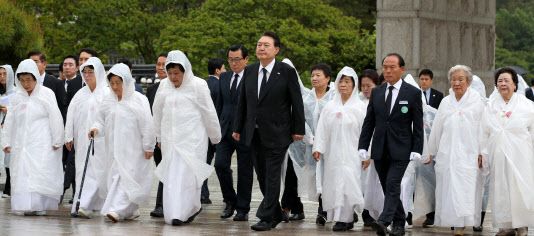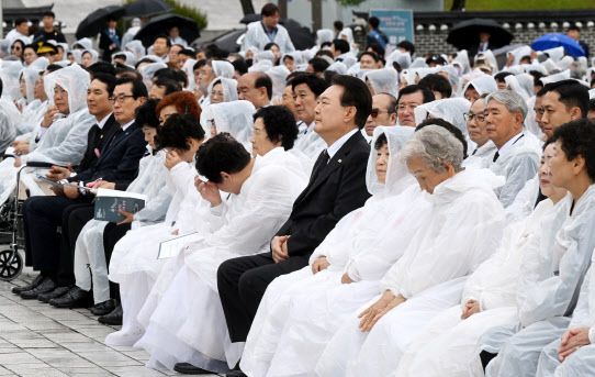 윤 대통령은 흰색 우비를 입은 참석자들 사이에 앉았다. 양옆에도 5월 어머니들이 자리했다. 어머니들은 기념식 중간중간 눈물을 훔쳤다.