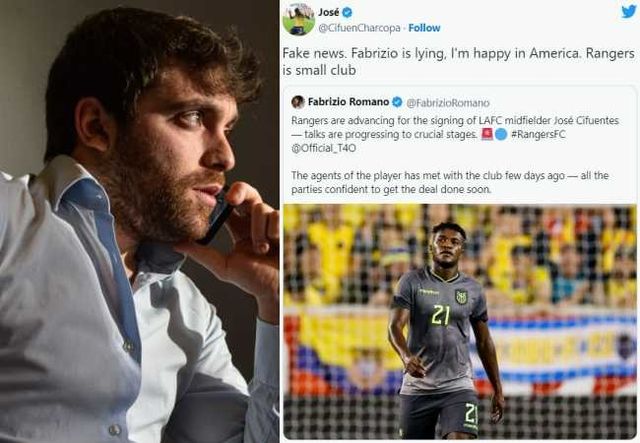 이어 "로마노가 목요일 아침에 올린 뉴스가 논란이 됐다. 미국 메이저 리그 사커(MLS) 로스앤젤레스 FC(LA FC)에서 뛰고 있는 호세 시푸엔테스가 스코틀랜드 프리미어십 레인저스로 이적하는 것이 임박했다는 소식이었다"라고 덧붙였다.