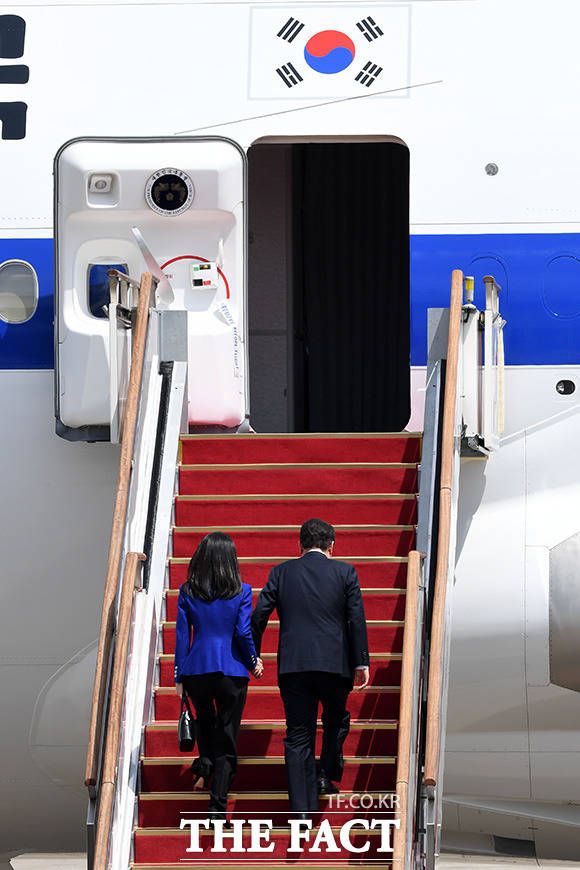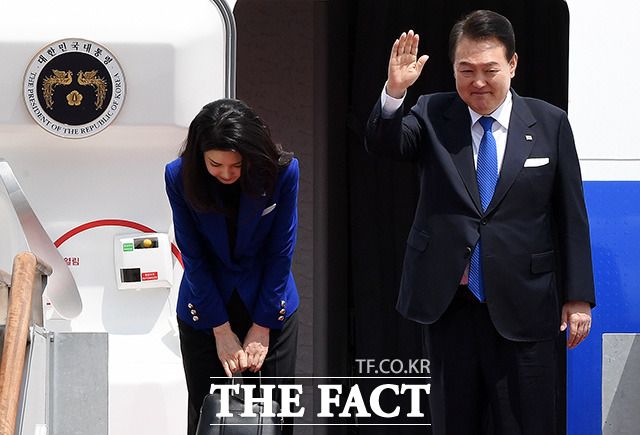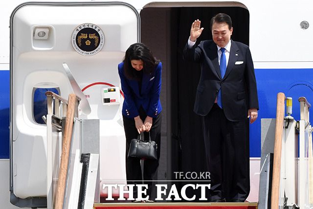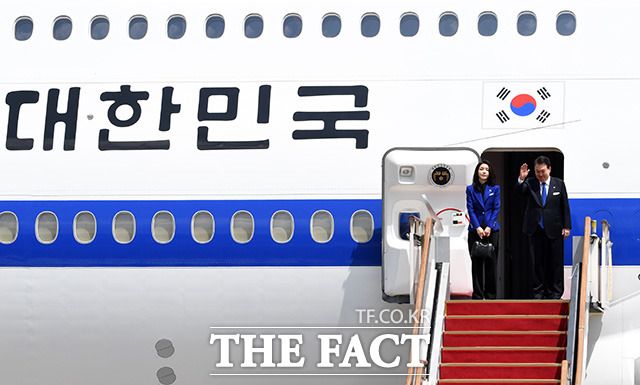 [더팩트ㅣ성남=남용희 기자] 윤석열 대통령(오른쪽)과 부인 김건희 여사가 주요 7개국 정상회의(G7) 및 해외 일정을 수행하기 위해 19일 오후 경기도 성남시 서울공항에서 공군 1호기에 탑승하며 인사를 하고 있다.