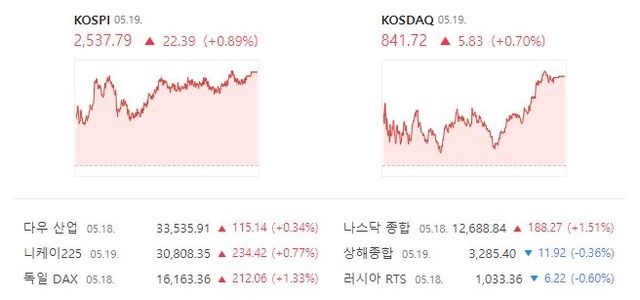 코스피지수는 전 거래일보다 0.89%(22.39포인트) 오른 2537.79에 거래를 마쳤다. 투자자별로 보면 외국인과 기관은 각각 5546억 원, 5590억 원어치를 샀다. 반면 개인은 1조1026억 원을 순매도했다.