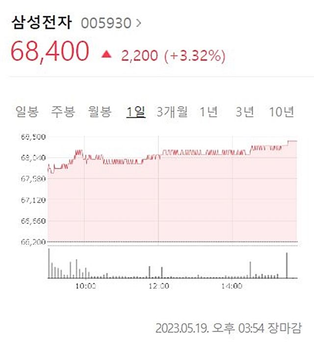 이날 한국거래소에 따르면 삼성전자는 전 거래일 대비 2200원(3.32%) 오른 6만8400원에 장을 마쳤다. 이는 연중 최고치 경신이다.