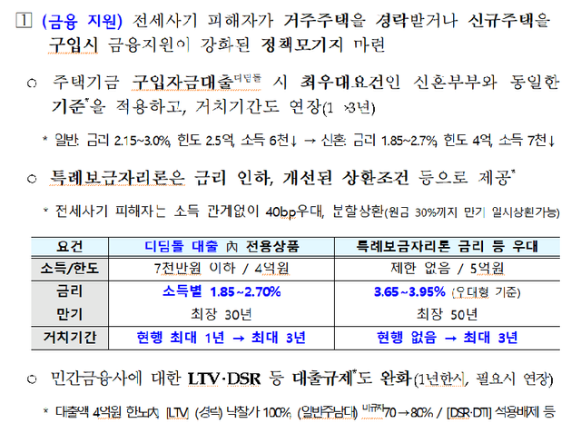 아울러 지금 당장 피해로 인해서 날리게 된 세입자의 전세보증금(평균 약 0.8억원)에 대해서도 최대한 만기를 길게해서 (약 10년) 목돈이 없는 피해자가 갚아나갈 수 있도록 지원할 예정입니다. 또한 전세사기 피해자에겐 주택구입담보대출과 관련해 3년의 거치기간도 줍니다.