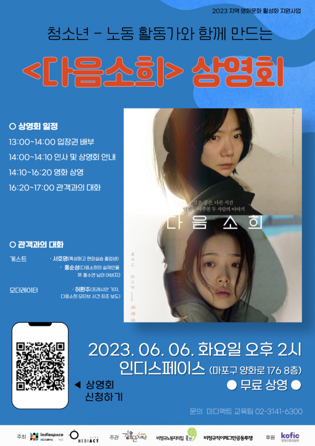 영상미디어센터 미디액트와 독립영화전용관 인디스페이스가 청소년과 노동 활동가를 초청해 영화 <다음 소희> 상영회와 토크 프로그램을 개최한다.