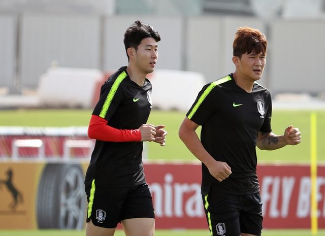 손흥민(왼쪽)과 김민재가 2019년 1월 18일(현지 시각) 아랍에미리트 두바이 NAS 스포츠 컴플렉스에서 몸을 풀고 있다. / 이하 연합뉴스