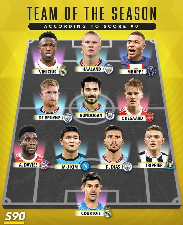 최전방부터 화려함을 넘어선 3명이 이름을 올렸다. 비니시우스 주니오르(레알 마드리드), 엘링 홀란드(맨체스터 시티) 그리고 킬리안 음바페(파리 생제르맹)이 배치됐다. 먼저 비니시우스는 올 시즌 모든 대회에서 23골 20도움을 올리며 레알의 에이스 역할을 톡톡히 했다. 특히 비니시우스는 올 시즌 총 285개(성공 105회)의 드리블을 보여주며 압도적인 퍼포먼스를 자랑했다.
