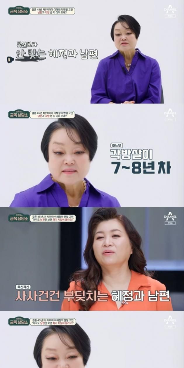 뉴스1에 따르면 올해 결혼 45년차가 됐다는 이혜정은 "남편이랑 하나도 안 맞는다. 복권보다 더 안 맞는 것 같다"라며 성향 차이가 크다고 밝혔다. 그러면서 "당연히 각방 쓴다. 각방살이 7~8년 된 것 같다"라고 해 놀라움을 안겼다.