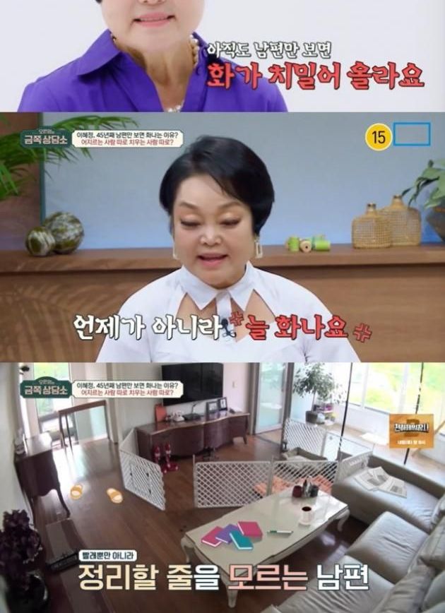 이에 이혜정은 "언제가 아니라 늘 화가 나 있다. 세월이 이렇게 많이 흘렀는데 신혼 때나 지금이나 제 화가 똑같다. 결혼 생활 45년간 (정리 등) 부탁했던 것들이 아직도 안 바뀌어서 마음이 상한다"라고 고백했다.