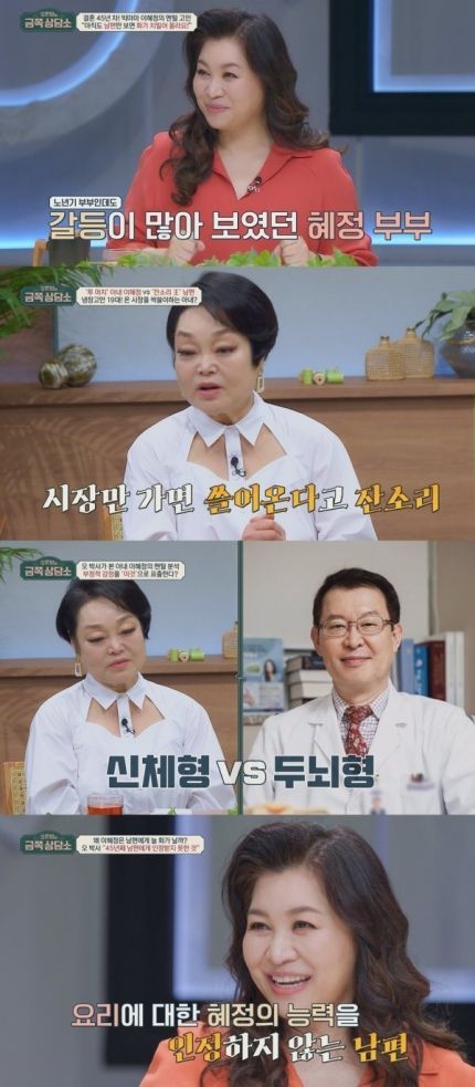 이혜정의 평생 고민은 남편의 입이 짧은 것, 식성이 맞지 않는 것 등이다. 요리연구가에겐 치명적인 고민일 터다. 이혜정은 "식탁 앞에서 즐거워야 하는데, 그게 너무 고통이다. 남편이 복스럽게 먹는 모습을 보는 게 소원"이라고 바랐다.