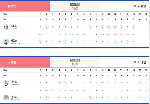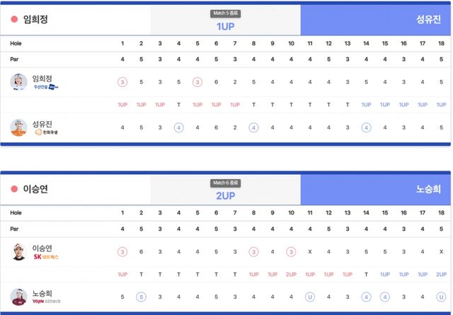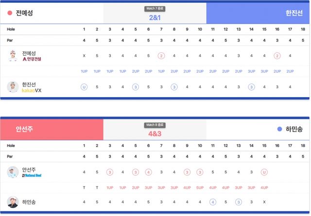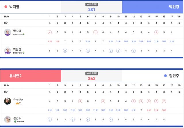 -UP(승) DN(패) U(홀포기 승) X(홀포기) H(홀 동률) Tie(A/S)(코스동률) n & n(승수&남은홀수) n Holes(연장홀수)