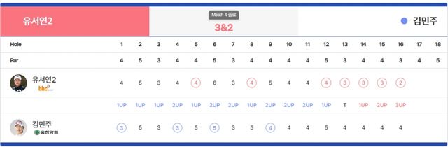 -UP(승) DN(패) U(홀포기 승) X(홀포기) H(홀 동률) Tie(A/S)(코스동률) n & n(승수&남은홀수) n Holes(연장홀수)