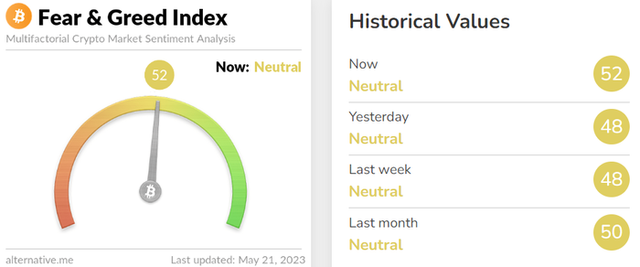 비트코인의 투자심리는 전날보다 개선됐다. 이날 암호화폐 데이터 제공 업체 얼터너티브(Alternative)의 자체 추산 '공포·탐욕 지수'는 전날보다 4포인트 오른 52를 기록하면 '중립' 단계가 지속됐다. 해당 지수는 0에 가까울수록 시장의 '극단적 공포'를 나타내며, 100에 가까울수록 '극단적 낙관'을 의미한다.