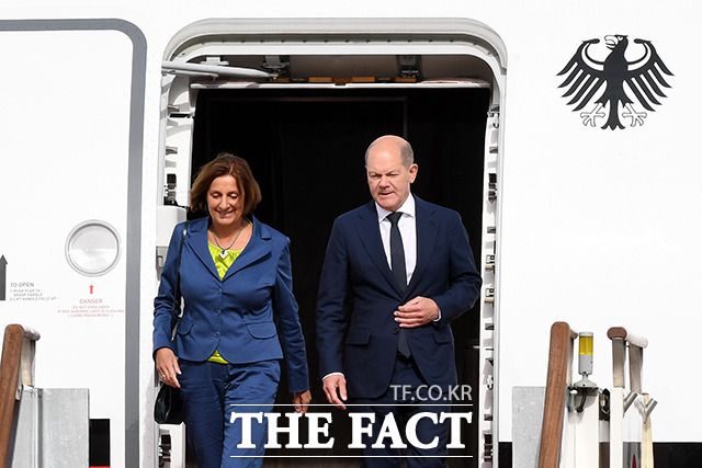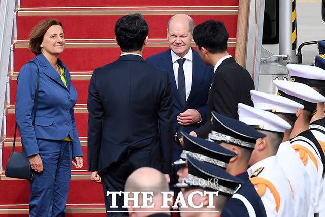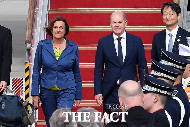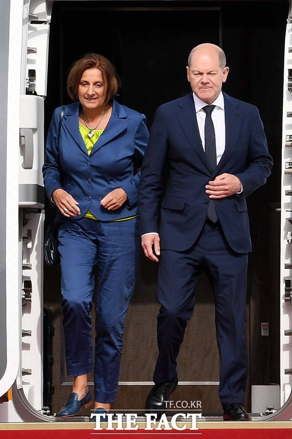 [더팩트ㅣ성남=남용희 기자] 올라프 숄츠 독일 총리(오른쪽)와 부인 브리타 에른스트 여사가 21일 오후 경기도 성남시 서울공항에 도착하고 있다.