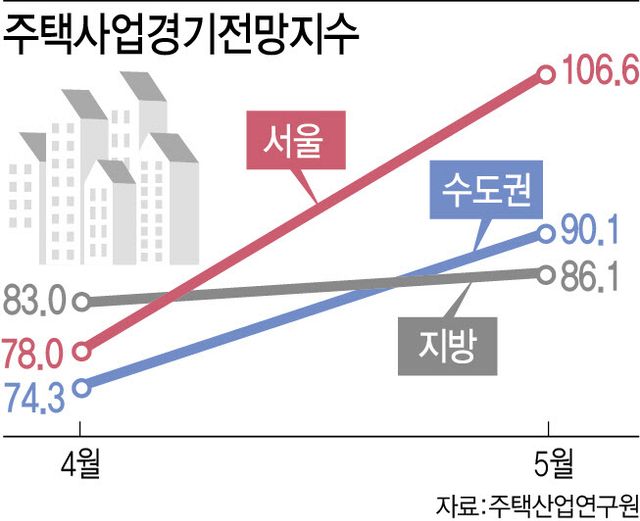 21일 주택산업연구원(주산연)이 공개한 자료에 따르면 이달 서울 주택사업 경기전망지수는 106.6으로 지난달(78.0) 대비 28.6포인트 급등했다. 서울에서 이 지수가 기준선(100.0)을 넘어선 것은 지난해 4월 이후 1년 1개월 만이다. 이는 한국주택협회와 대한주택건설협회 회원사 500여곳을 대상으로 주택사업의 체감경기에 대한 설문조사를 한 결과다. 서울에 이어 인천도 66.6에서 80.0으로 올랐고, 경기도 78.3에서 83.7로 각각 13.4포인트와 5.4포인트 상승했다.