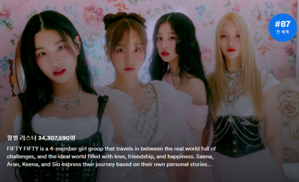 앞서 FIFTY FIFTY(피프티 피프티)는 지난 5월 7일 월간 리스너 3천만 명을 돌파한 바 있다. 이는 FIFTY FIFTY(피프티 피프티)가 데뷔 170일 만에 일궈낸 성과이며 K팝 역대 최단 기간의 기록이기도 하다.