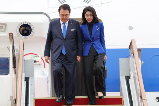 윤 대통령은 이날 오후 경기도 성남 서울공항에 도착한 대통령 전용기인 공군 1호기에서 김건희 여사와 함께 내렸다.