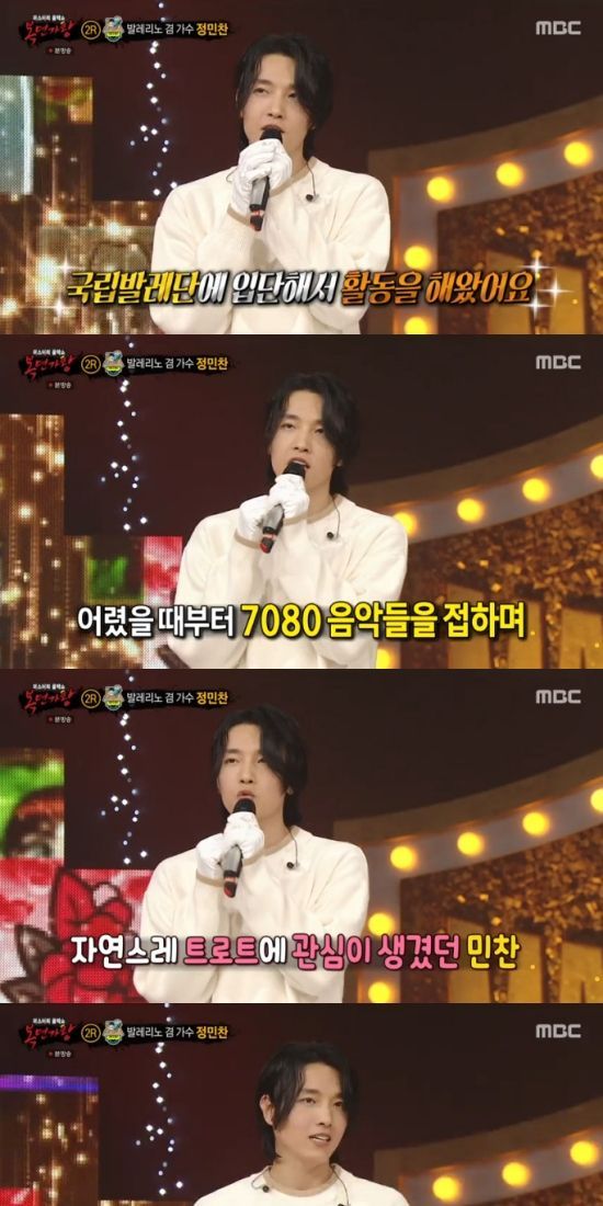 정민찬은 "저는 한국예술종합학교를 졸업하고 국립발레단에 입단해서 활동을 하다가 오랫동안 부모님께서 전통찻집을 하셨다. 그래서 7080 음악을 많이 되게 많이 접했었는데 그래서 트로트가 되게 익숙한 장르고 방송을 보다가 나태주 씨가 나오는 프로그램에서 태권도와 트로트를 접목하는 걸 보고 '저렇게 뛰고 돌고 하는데 노래가 되나?' 그래서 저도 한번 발레랑 트로트를 접목해서 하게 됐다"라며 털어놨다.