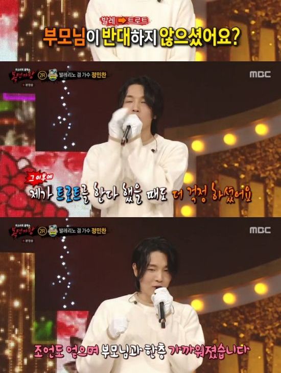 정민찬은 "'네가 뭔데 트로트를 하냐. 네가 노래를 잘하나. 뭘 잘하나' 이렇게 말씀하시다가 사실 발레는 이야기를 못 나눴다. 아시는 게 없다 보니까. 트로트는 저보다 훨씬 더 많이 알고 계시더라. 어드바이스도 해주고 이래라저래라 하시는 게 많은 도움이 됐다"라며 전했다.