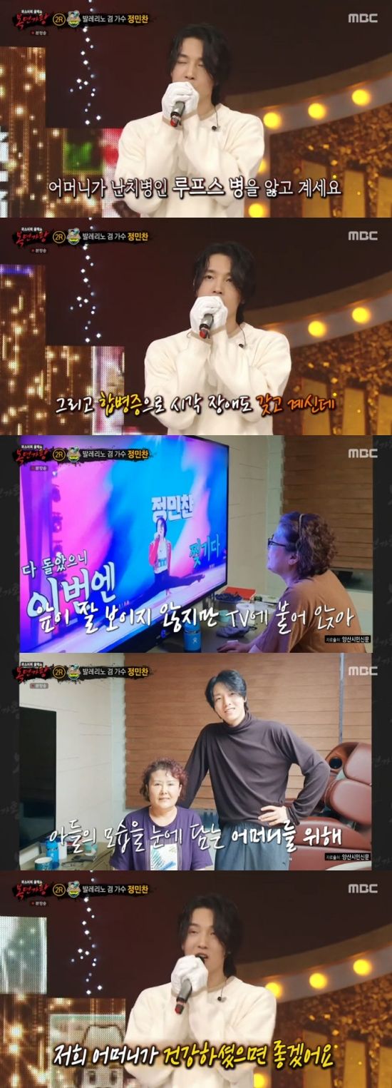 특히 김성주는 "정민찬 씨가 오늘 '복면가왕'에 나온 건 어머님을 위해서라고 한다"라며 귀띔했고, 정민찬은 "저희 어머니가 희귀 난치병인 루프스 병을 앓고 있다. 그 합병증으로 시각 장애를 앓고 있는데 시력이 거의 안 보이신다. 의사 선생님도 언제 실명될지 알 수 없다고 했다. 수술도 불가능한 상태다. TV로 저를 보는 걸 되게 좋아하신다. 그런 모습을 더 보여드리고 싶어서 이렇게 '복면가왕'에 나오게 됐다. 보시라고"라며 밝혔다.