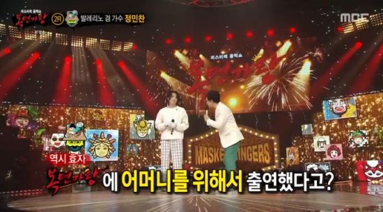 21일 방송된 MBC '복면가왕'에서는 '나실 제 괴로움 다 잊으세요 제 노래로 효도할게요 효자'의 정체가 정민찬으로 밝혀진 장면이 전파를 탔다.